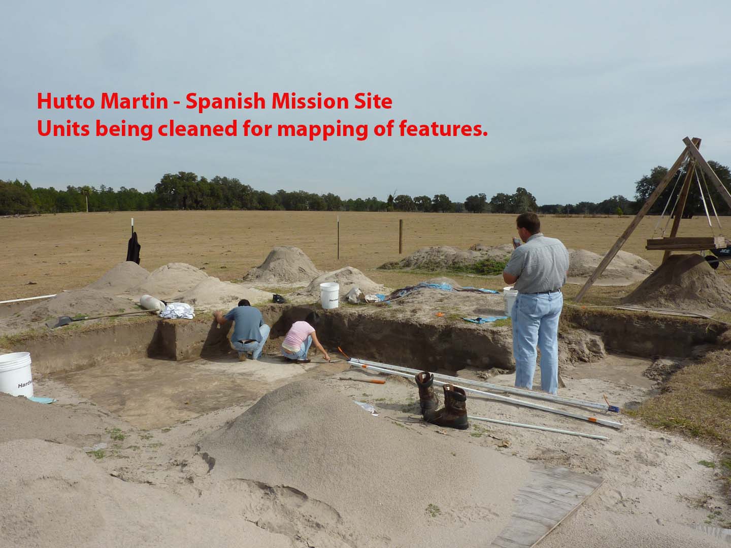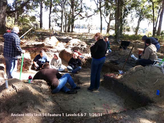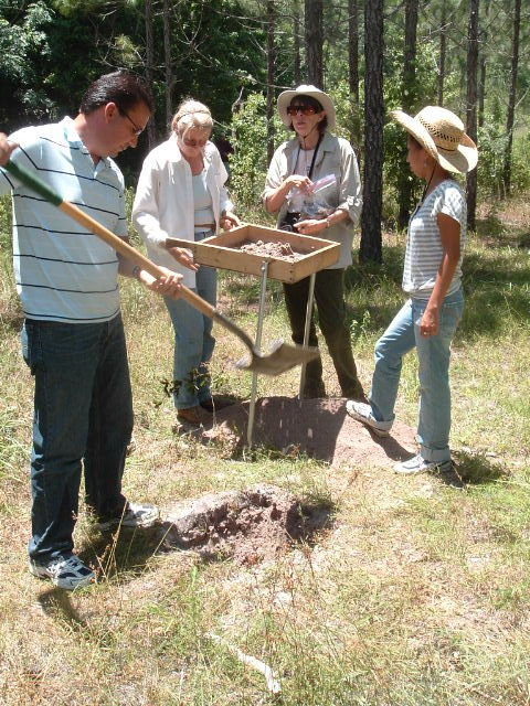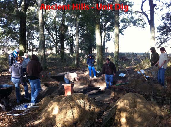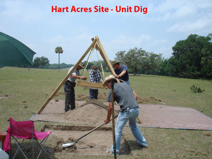 - Dig Units - We dig 2 meter X 2 meter holes and bag and record all artifacts found for every 10 cm that is dug. All Units have the GPS Coordinates recorded, the Grid Coordinates recorded, and all artifacts found are bagged and tagged by the level that is dug. Larger tripod mounted screens are used to sift through shovel fulls of dirt. All Special Features of soil types and colors are mapped at the bottom of each 10 cm that are dug to help determine what was on the site years ago. The total depth dug in each unit is recorded as the Height of Instrument for review with each unit dug in the area. Samples of charcoal are taken for carbon dating at a later time. Sometimes we use a water screening method to find very small items that remain in the dirt after the normal ¼ inch screening is performed.