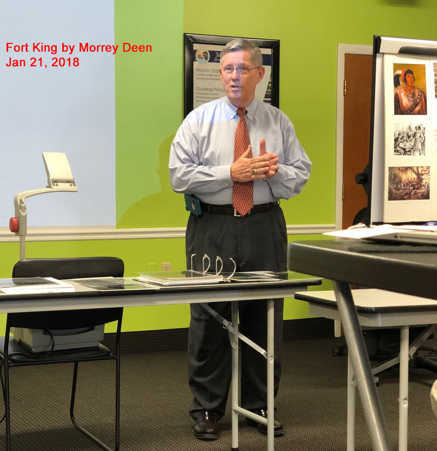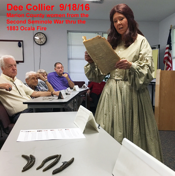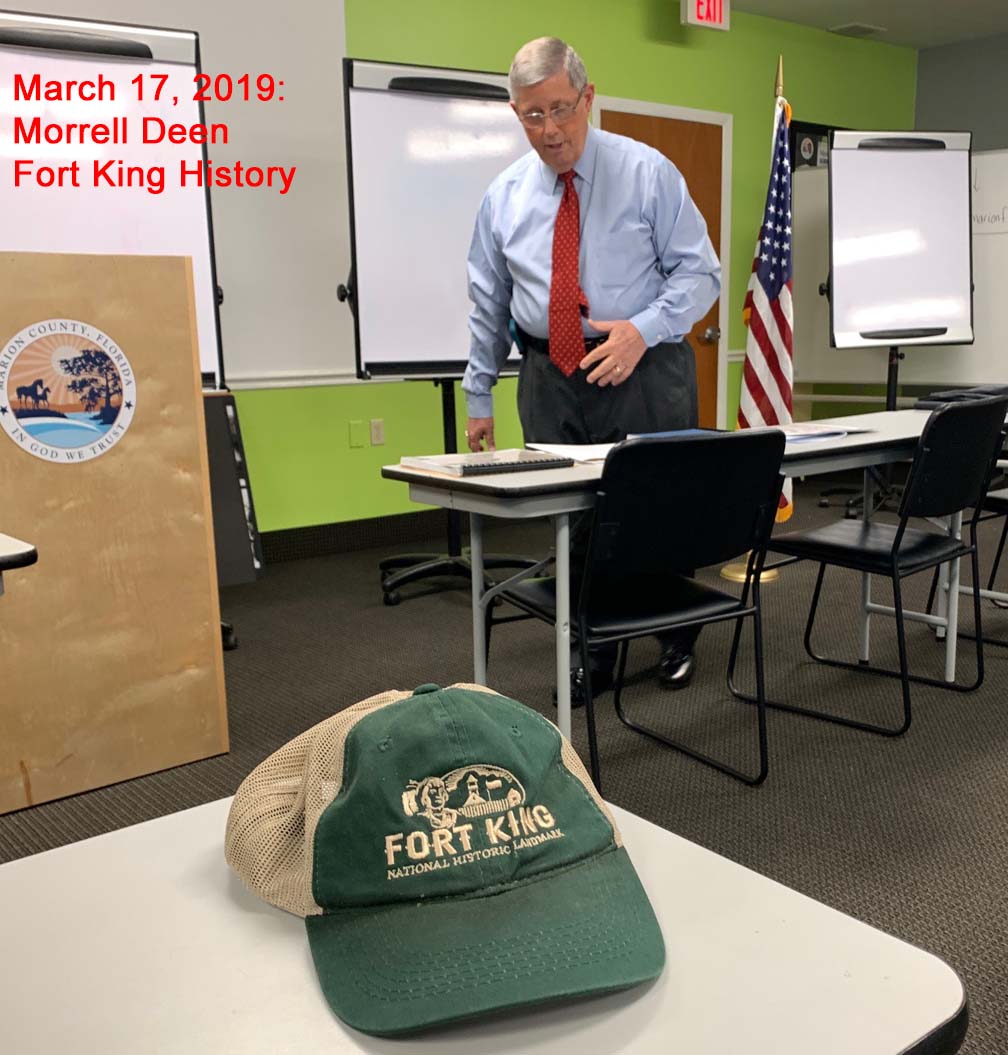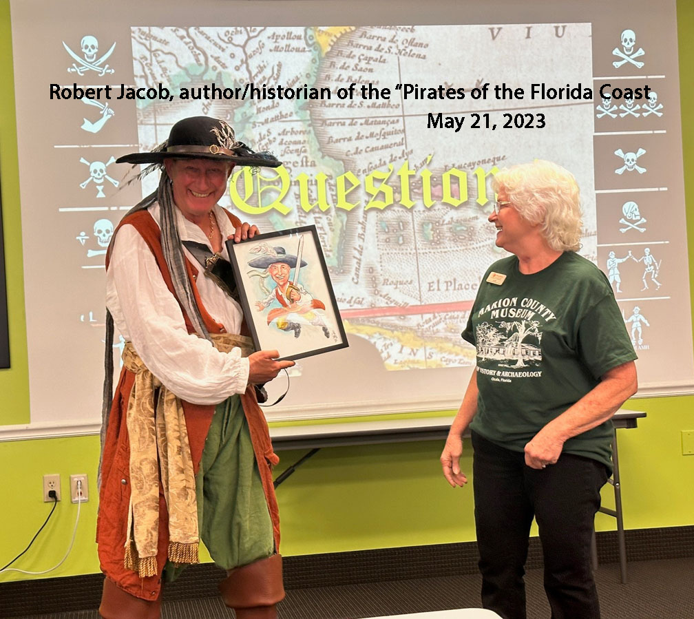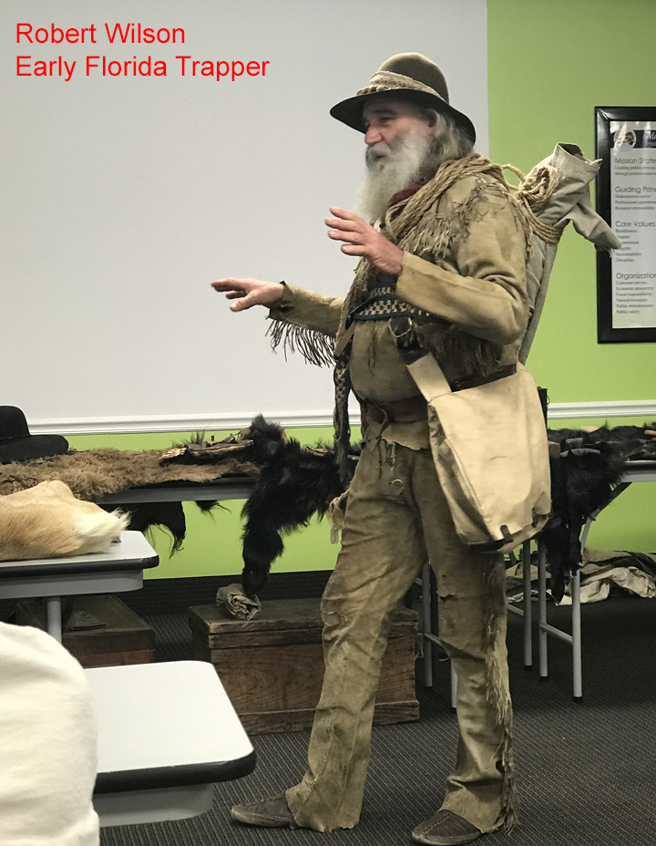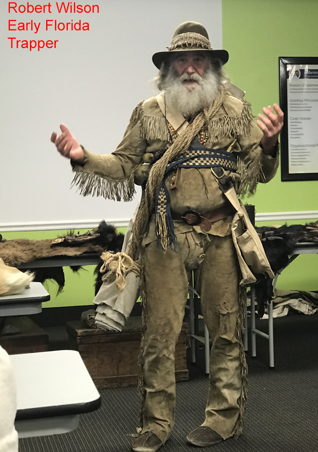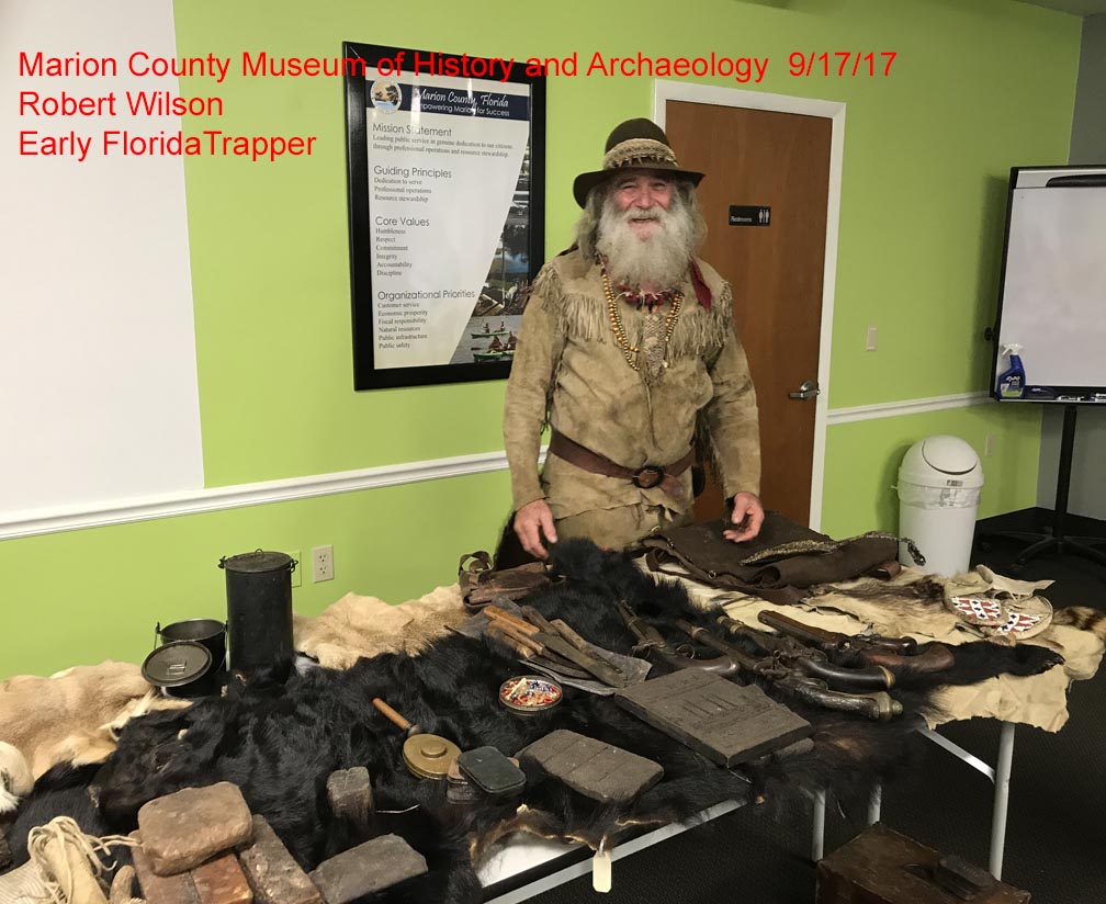 News: News will be updated as it occurs. Lectures will be at Green Clover Hall, 319 SE 26th Ave., Ocala, in the McPherson government complex. The program will begin at 2 p.m. Following the program, there will be a reception at the Marion County Museum of History and Archaeology, 307 SE 26th Terr., Ocala, also in the McPherson government complex. For more information, call 352-236-5245. The cost of the program is $5.00 with free admittance to museum members. All programs will be on the 3rd Sunday of odd months. Future Lectures: The museum future programs will be: The Marion County Museum of History and Archaeology’s next program is scheduled for July 20, 2025. Dr. Joe Knetsch will lecture on Medicine during the Civil War. Be sure and check back a week before each lecture to confirm it is still occuring. ********************************************************************************************************************** The museum’s Facebook page is at: https://www.facebook.com/search/top/?q=marion%20county%20museum%20of%20history%20and%20archaeology Saturday, 8/10/19 at the Fort King National Historical Landmark, the Fort King Heritage Association presented to the Marion County Museum of History and Archaeology a leather bound multipage reproduction copy of the hand written minutes of the first Marion County Commission meeting that took place in the fort on Friday, February 20, 1846. You can actually read the cursive script that was hand written on that day. FKHA president Bill McCall, and Board members, Diane Trice and Robin Corsiglia presented to the Marion County Museum of History and Archaeology trustees Zack Pagels, Vanessa Thomas, and Judy Delk. Past Lectures: Date: Speaker/Subject 10/12/11: Dr. William Marquardt, Florida Museum of Natural History (Randell Research Center at Pineland). 11/16/11: Ernest Jernigan, Ocala Historian 12/14/11: Dr. Barbara Purdy, Archaeologist University of Florida 1/11/12: Mr. J.T. Glisson, author of “The Creek” 2/11/12: Rich Estabrook, Florida Public Archaeology Network 3/14/12: Dr. Michael Gannon, Historian, University of Florida 4/19/12: Claude Van Order, Flint Knapping 7/22/12: Dr. Joe Knetsch- Spanish Land Grants and the incoming Seminoles during the late 18th and early 19th century. 8/19/12: Dr. Willet Boyer - The Gordon Collection and things we learned from it. 9/16/12: Dana Ste Claire - The Cracker Culture in Florida History 10/28/12: Dr. Keith Ashley - Archaeologist Dr. Ashley, of the University of North Florida will be speaking on the Spanish mission era, with a focus on his work and recent discoveries at the Guadalquini mission site. 11/18/12: Carol Lopez-Bradshaw - In 1768 over 1,400 people left the Mediterranaen Island for the British East Florida. Menoran of the Menorcan Cultural Society in St. Augustine! 1/20/13: Michael C. Mason -Ocklawaha River Steamboats, Turpentine Stills and More 3/24/13: The Patriot War in Florida by James Cusick 5/19/13: The Fort King Site by Gary Ellis; Fort King Heritage Association 7/14/13: The Great Depression in Florida by Dr. Joe Knetsch 9/22/13: Colinial Trappers - Trader Lore - by Robert Wilson 11/17/13: Silver Springs, Florida by Bruce Mozert 1/19/14: All I ever wanted tobe was a cowboy, by Bill Roberts 3/16/14: Ma Barker & the Shootout at Ocklawaha, by George Albright & Carson Good. 5/18/14: Using Social History Approaches in Family History Research by Jim Vearil 7/27/14: Dr. Joe Knetsch is scheduled for July and his topic will be Fort Drane and the Seminole Wars. 10/5/14: Ronald Haase - Cracker Architecture 1/18/15 Peter Mullins - A a program on family feuds that happened right after the War Between the States. Two of the family feuds in Florida are the Barber and Mizell families from Marion County, Florida. 3/22/15 Turpentine Industry by Barbara Clark, 5/17/15 Florida Cattle Ranching By Robert L. Stone 7/19/15 Dr. Joe Knetsch - Marion County Medical Issues of long ago. 11/15/15 Delee Perry, owner and operator of the Perry Swim School, will present a program entitled ‘SilverSprings and Other Florida Springs’ 1/17/16 “Sybil Bray And Her Salty Crackers Series of Books” by Nancy Bray Bowden 4/3/16 A Conversation with Roy Abshier, a long time resident of 5/15/16 Sesquicentennial Reenactment of the Escape by Boat of Confederate Officers- Kim Cullars 7/17/16 Bill Partinton speaks about Stopping the Cross-Florida Barge Canal 11/20/16 Cynthia Wilson-Graham(Coauthor of a book "Remembering Paradise Park" at Silver Springs) Buy her book at the Museum. 1/15/17 Slavery in the USA, Florida, and Marion County by Mr. Emmett Coyne 3/19/17 The Highlands Hotel & Early Golfing in Ocala by Daniel J. Jones 5/21/17 Trails , Tales, and Where by Annabelle Leitner - Historian 7/16/17 Utopian Communities by Dr Joe Knetsch - Historian 9/17/17 Trappers & Traders by Robert Wilson (tenative) 9/17/17 Trappers & Traders Presented by Mr. Robert Wilson, living historian. A traveling interpretative historian, Mr. Robert Wilson is the owner of Wizard's Gun shop, a gunsmith, expert on trapping, and instructor on the ways of trappers & traders in early Florida. Having participated in the Silver River Museum's Ocali Days and Knap In, and doing approximately 10-30 events a year for State Parks, Boy Scouts, churches, private groups starting in 1993, he became a regular at the State Park system in 2000, and has participated on a regular basis since. He has done these programs at approximately 12-15 state parks through the years. He also does workshops/programs on Women in the Outdoors, and for the Wild Turkey Federation. A passion of his, he claims he was born 200 years too late. During these events, he does primitive camping from two to ten days at a time. The art and lifestyle of trappers and traders is represented in exhibits and in action. 11/19/17 Leah Oxendine is a historical reenactor, musician and 21-year-old author from North Marion County. Her book The Rebels of Florida was published and released to the public through Ama