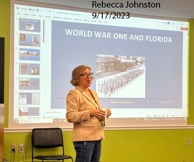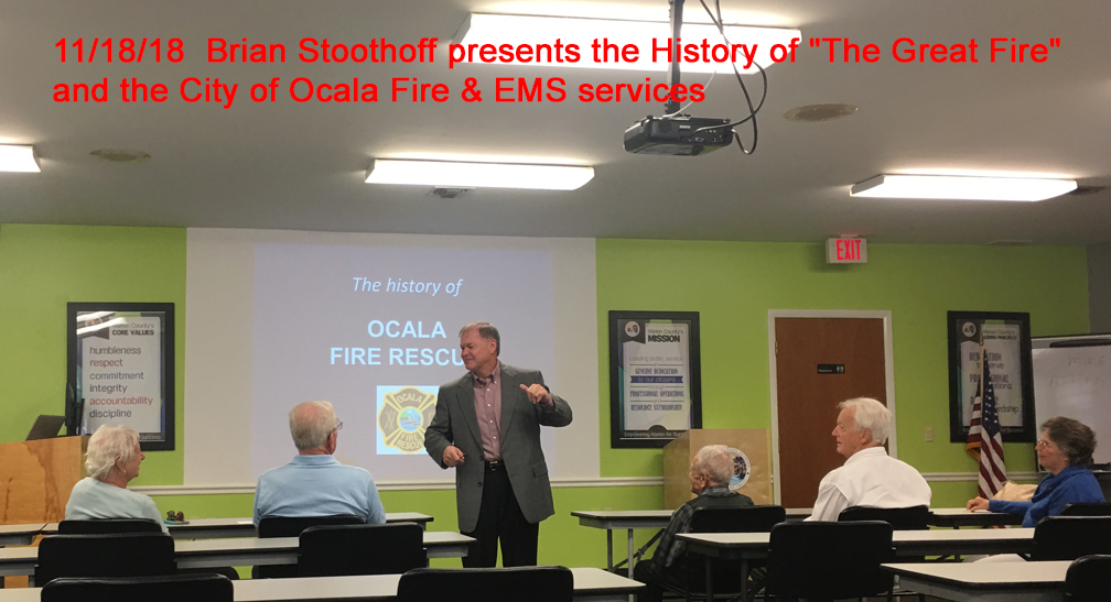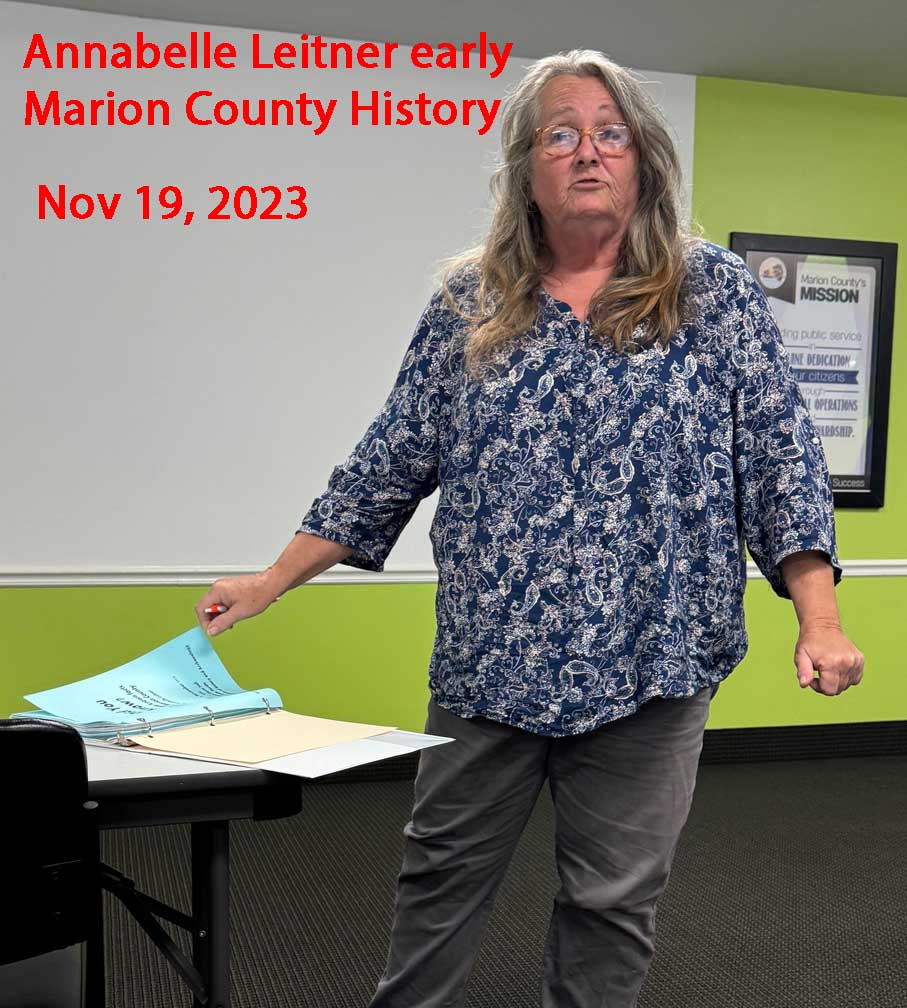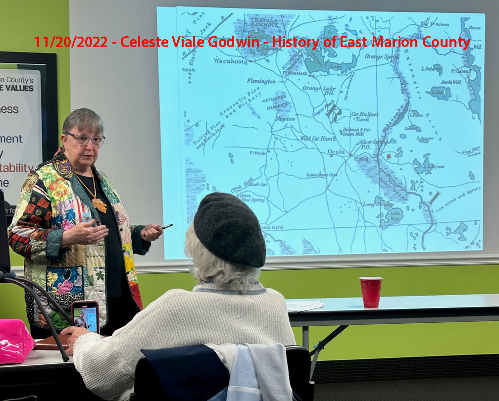 5/19/19: "Early agriculture in North & NW Marion Co" by Annabelle Leitner 11/17/19: Peter P. Mullen, Honorable Order of Kentucky Colonels, Callahan, Florida presents the Bicentennial of the Adams~Onis Treaty – FEB 22, 1819 1/19/20: Peter P. Mullen, Honorable Order of Kentucky Colonels, Callahan, Florida presents "The History & Origin of the 1918-1920 Spanish Flu Pandemic" July 18, 2021 Celeste (Goodwin) Viale: Early Settlement and Life in Marion County March 20, 2022 Paul Bloom - History of the Marion County Sherriff's Department. See below for the later lectures. Pictures of prior Lectures: *************************************************************************